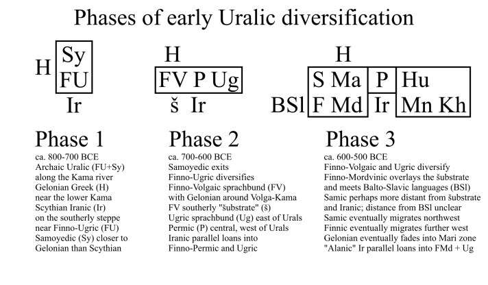 The following figure provides a brief overview of my working Helleno-Uralic diversification model: